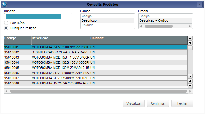 Vale ressaltar, que ao realizar à pesquisa por uma determinada descrição, os registros localizados no cadastro de produtos que atendem ao conteúdo do filtro são apresentados de forma ordenada considerando como critério de ordenação à descrição dos mesmos e não o código.