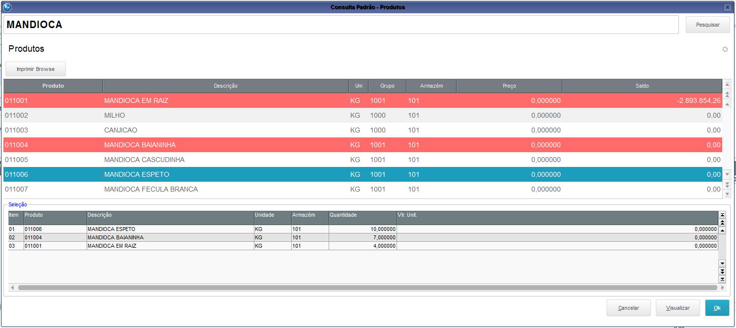 Quando a consulta é executada a partir das rotinas descritas anteriormente, o recurso de mult-seleção é disponibilizado, logo, ao confirmar à interface, é retornado ao grid de itens da rotina pela qual a mesma foi chamada, onde todos os produtos e quantidades são atualizadas conforme selecionado na consulta.