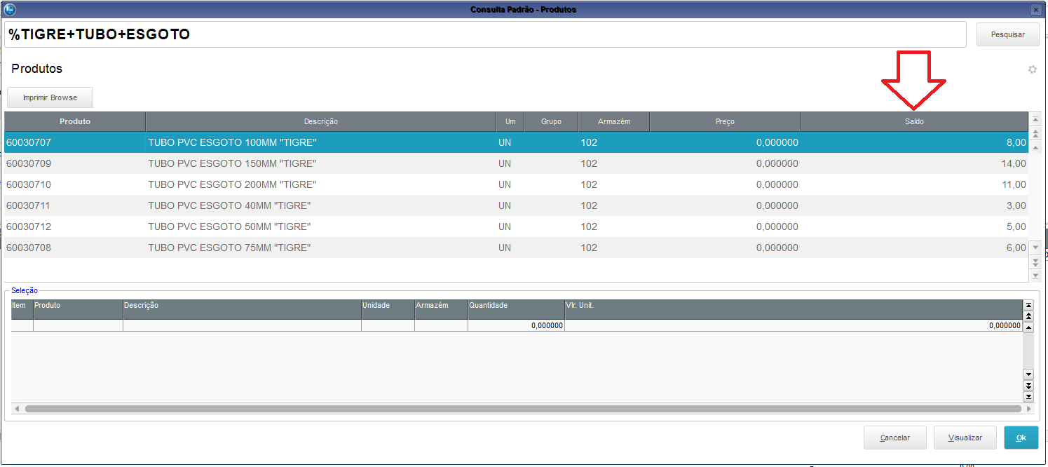 Outra informação presente na interface da consulta padrão personalizada de cadastro de produtos, se refere à coluna de saldo em estoque.