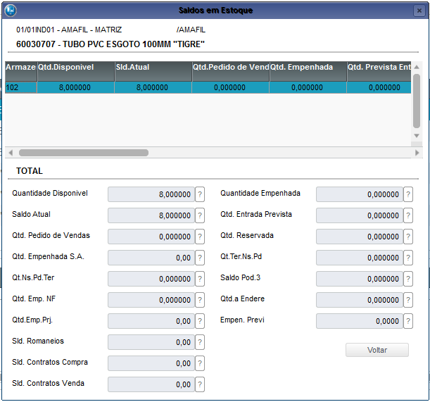 Por final, está disponível na interface da consulta de produtos à tecla de atalho F4 a qual aciona à interface padrão de consulta da posição em estoque a partir do produto em que se está posicionado na interface.