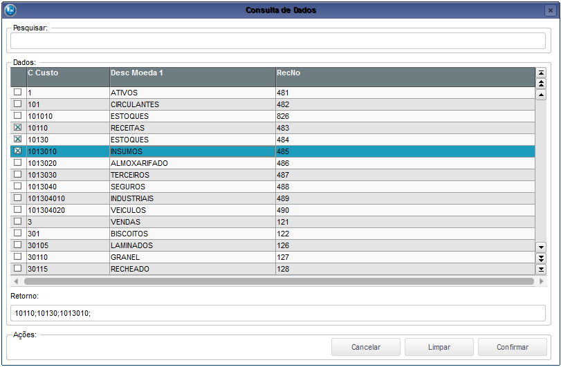 cAliasM, Caracter: Alias da tabela consultada aCamposM, Array: Campos que serão montados na grid de marcação cFiltroM, Caracter: Filtragem da tela (SQL) nTamanM, Numérico: Tamanho do campo de retorno cCheckM, Caracter: Campo que será checado lEditM, Lógico: Permite editar o retorno cSepM, Caracter: Caracter de separação do texto lAllFilM, Lógico: Identifica se são todas as filiais (inclusive de todas as empresas) lRetorn: retorno se a consulta foi confirmada ou não
