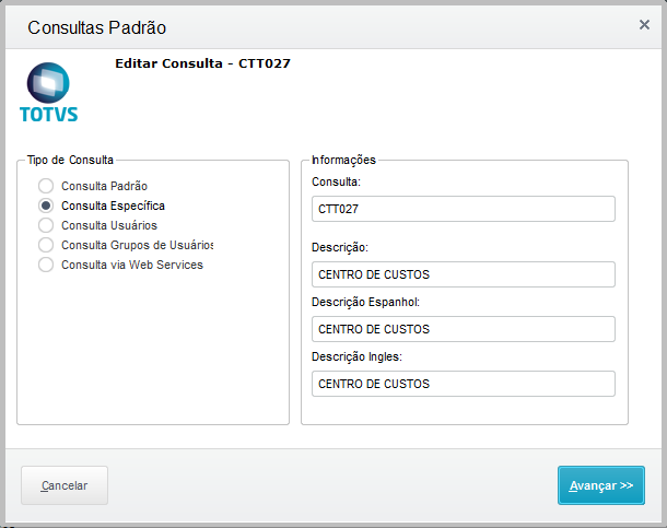 Exemplo de cadastramento da consulta CTT (consulta específica):
