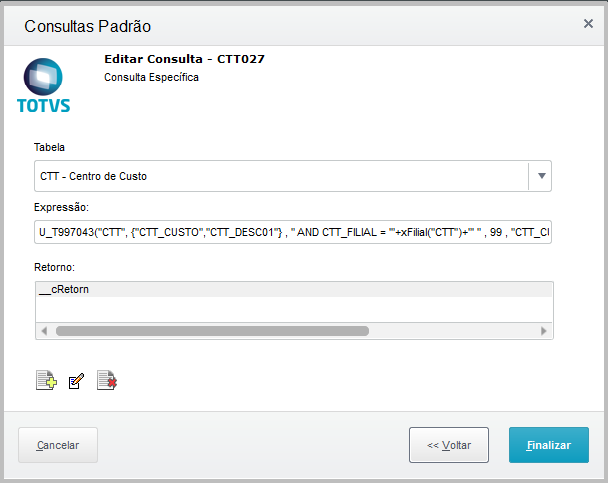 | Consulta Específica | SA1041 | Consulta Clientes | SA1 | U_T997041( "Consulta Clientes", "SA1", 2, "A1_NOME", "A1_NOME<>'XX'", .T.) | SA1->A1_COD, SA1->A1_LOJA |