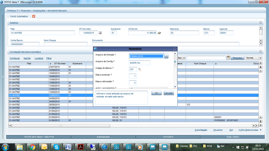 Módulo: Financeiro Atualizações -> Movimento Bancario -> Conciliacao Automatica