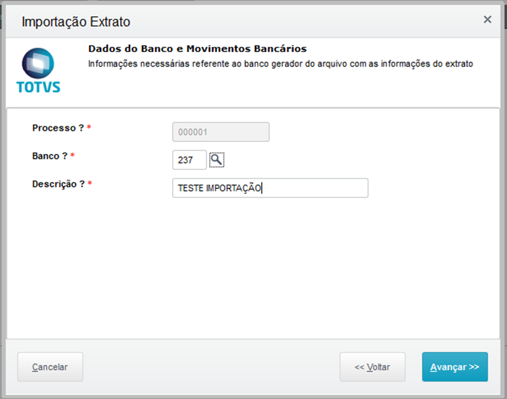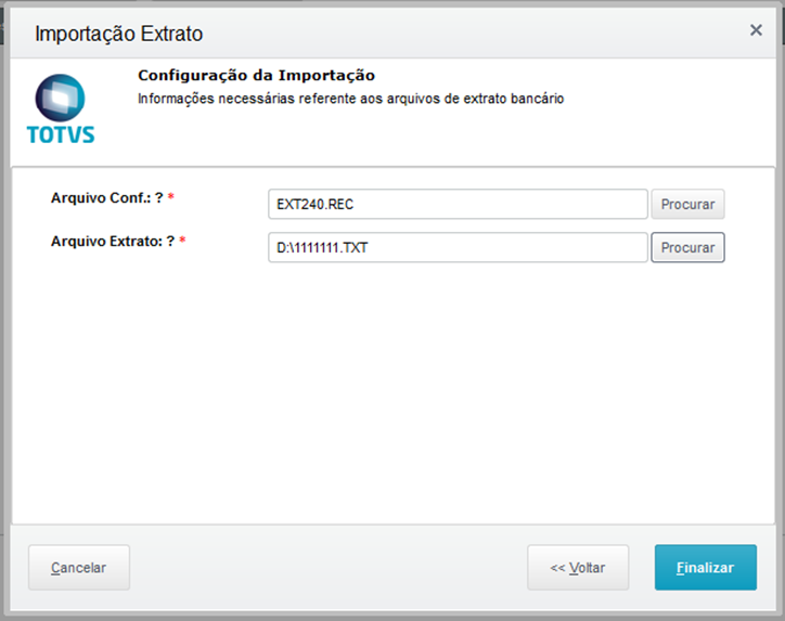 Ao selecionar a opção Importar, será apresentado um Wizard para auxiliar na importação do arquivo de extrato enviado pelo banco.