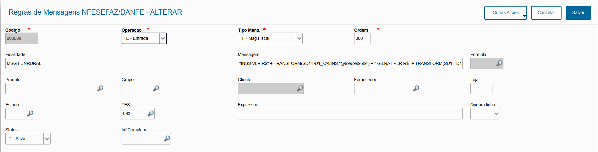 Status: informe se o cadastro da regra de mensagem está Ativo ou Inativo, onde somente as mensagens ativas serão impressas.